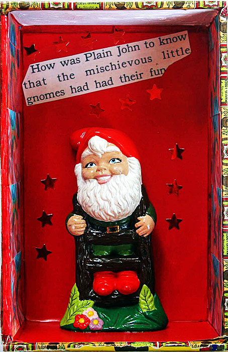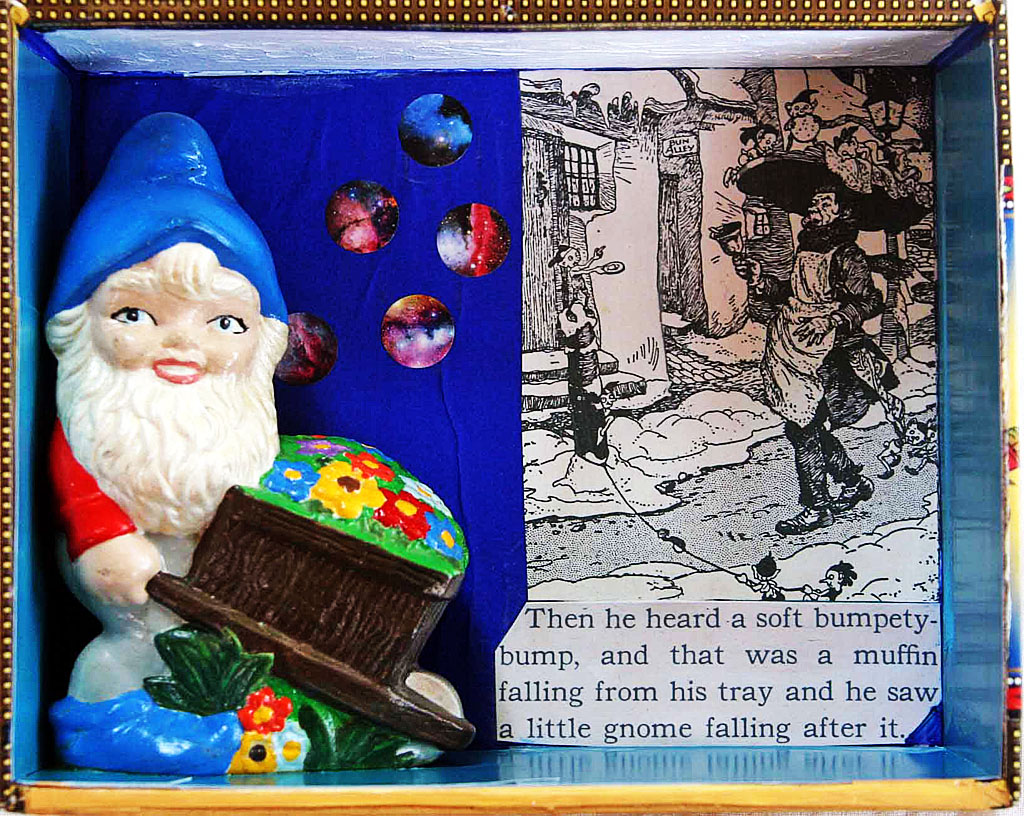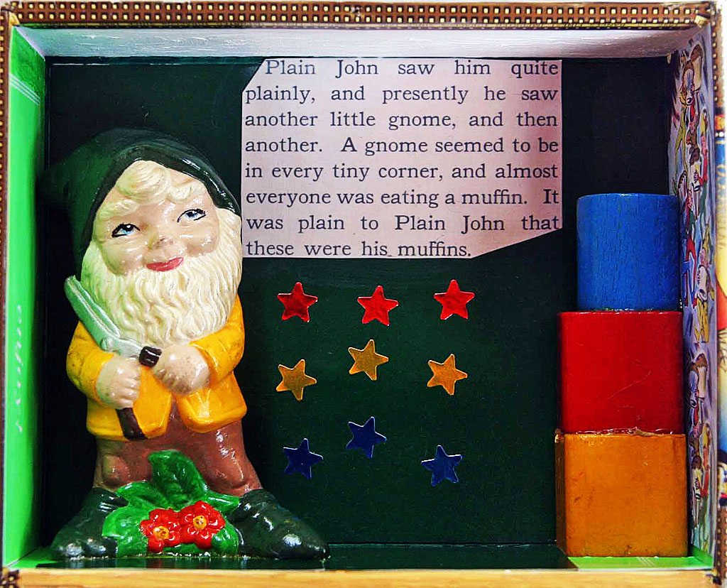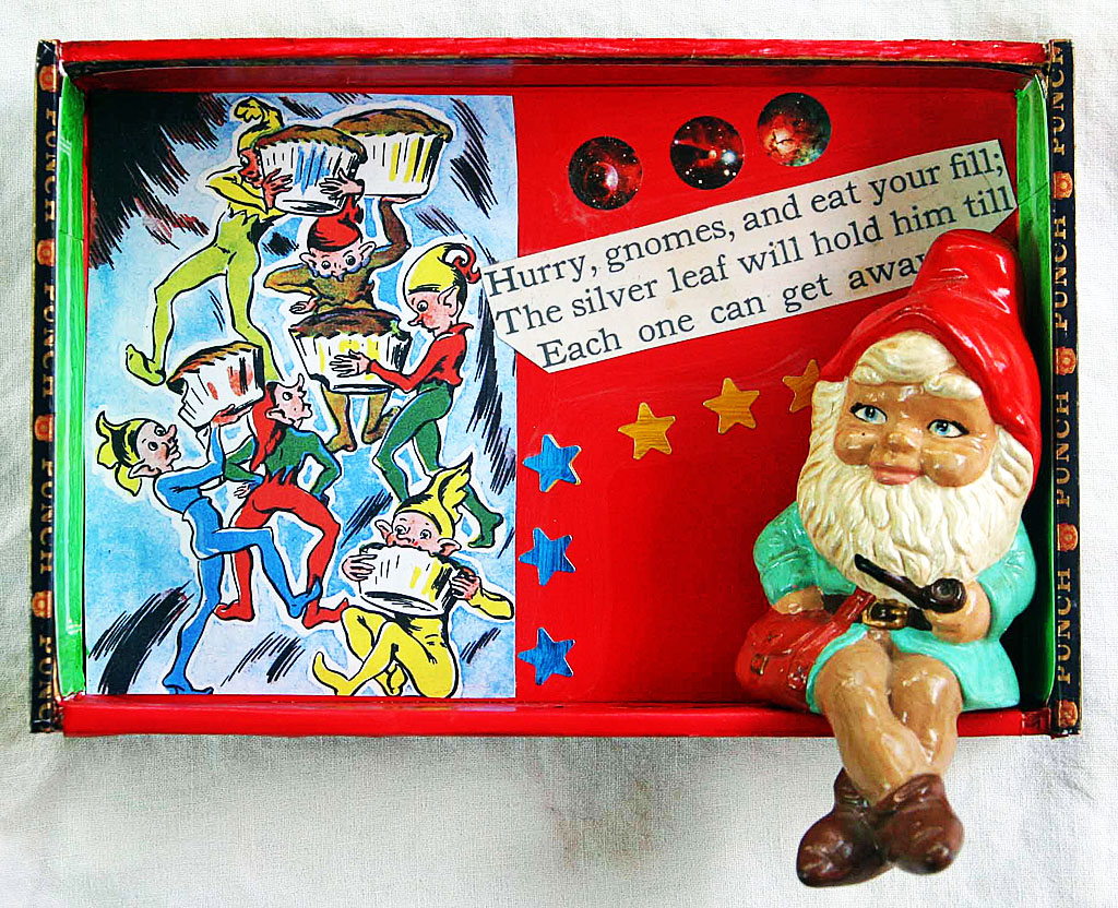 Each of the following vintage cigar boxes features a unique gnome or fairy tale figure from my collection. I used text and images from The Muffin Man and The Wishing Well, two fairy tales featured in a 1940 book called Rock-A-Bye Stories, to embellish the boxes.